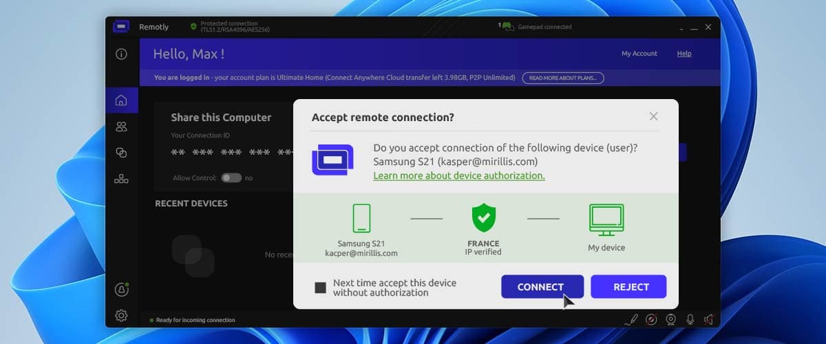 PH: You can absolutely connect using a VPN, especially if the person you’re connecting to already knows or trusts you. Your email address is also displayed in the connection pop-up, which helps identify you. It’s not easy for someone who is completely anonymous or random to connect through our system – we’ve done everything possible to prevent that. In addition to showing who is connecting to us and where they are connecting from, we can also authorize each device used to connect, which adds another strong layer of security. I personally trust this feature completely – I use it myself and was involved in its development. Moreover, our connection codes are very complicated with 3514 possible combinations, making them hard to guess. If a machine tried to generate codes automatically, our system would detect and block it. Even if I left the software running, no one could connect because a manual authorization of the connection is required every time. We’ve tackled the security bottlenecks and taken every precaution. I’m very security-conscious and constantly look for potential vulnerabilities that someone could exploit.