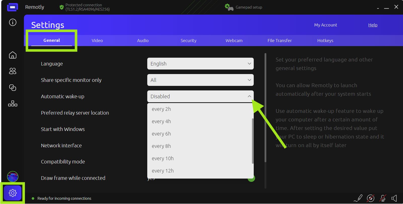 Secondly, to save energy on the remote computer, you can enable periodic wake-up mode in the General tab of your remote PC’s settings. This allows you to connect and stream the camera feed only when for example it’s time for your pet’s automatic feeding.