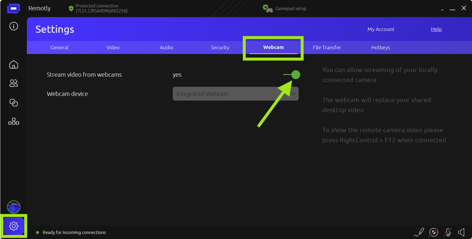 The remote webcam streaming feature was originally developed for security of ‘unattended’ connections (connections from your device to your another device). With webcam streaming on your remote computer, you can check if anyone else is accessing it (for example, when connecting to your home or office computer). Remotly users also use this feature to check how their pets are doing. Webcam streaming isn’t available for connections to third parties (via invitations or ID codes) – in other words, you can’t view another person’s webcam.