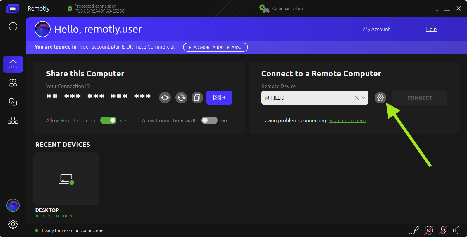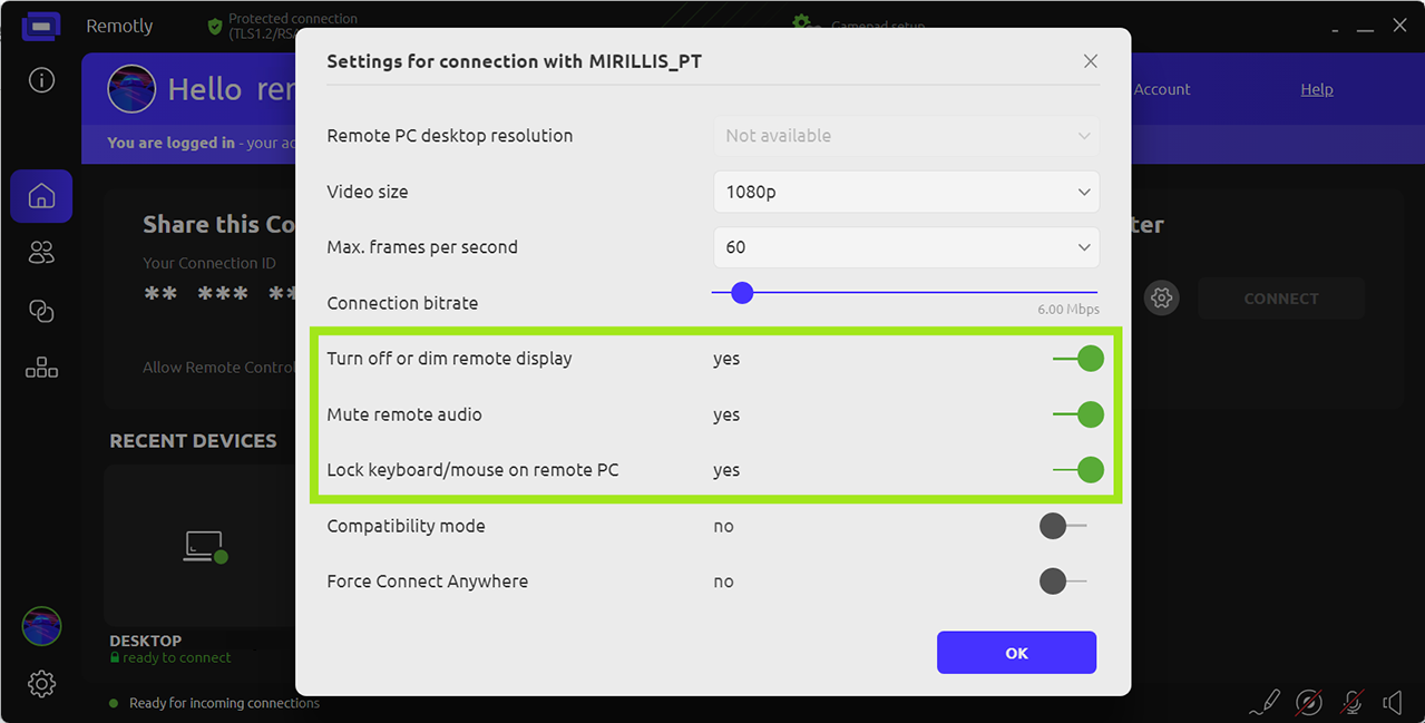 Unattended connections are connections without physical presence at the remote PC. To ensure that no unauthorized person can monitor or control your computer, or in the case of pets, that they can’t accidentally lock the keyboard, you can: dim the remote screen, mute sound, and lock the keyboard and mouse during the session. To do this, open the settings for your connection, click the settings icon, and adjust the sliders as needed.