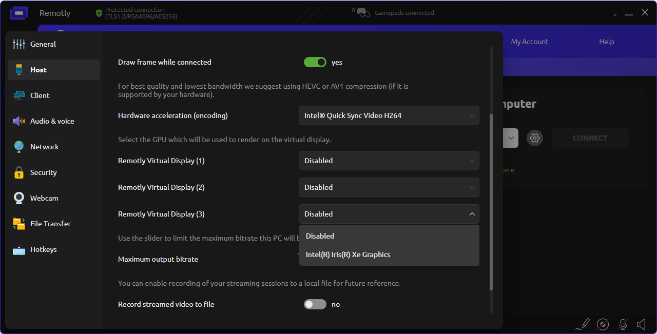 – You can configure video and assign specific GPUs to virtual monitors (Settings -> Video).