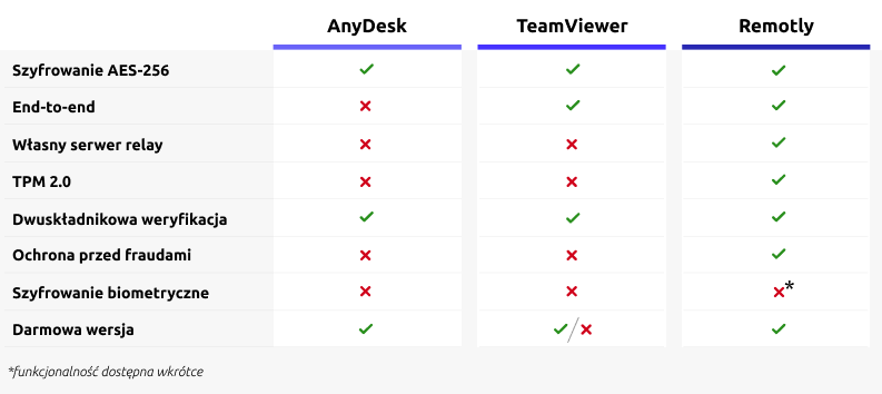 W poniższej tabeli znajdziesz podsumowanie najważniejszych aspektów bezpieczeństwa. Pamiętaj, że wybór odpowiedniego narzędzia do zdalnego pulpitu może mieć istotny wpływ na bezpieczeństwo danych i komunikacji w Twojej firmie i dla Twoich klientów.