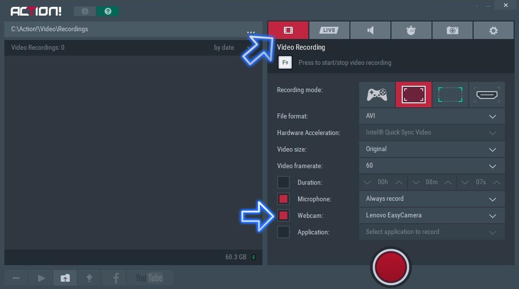 Następnie przejdź do zakładki nagrywania wideo i włącz opcję Webcam.