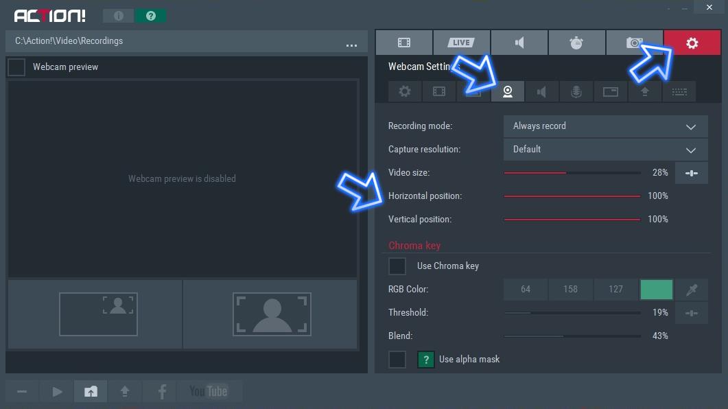 Jeśli chcesz dodać coś od siebie w swoich streamach, powinieneś dodać kamerkę do swoich nagrań. Przejdź do ustawień i kliknij ikonę kamery internetowej. Ustaw rozmiar i pozycję kamery internetowej. Jeśli chcesz zastosować efekt GreenScreen, aby nie wyświetlać tła pokoju lub biura, Użyj opcji Chroma key. Aby efekt ten działał poprawnie, nie zapomnij umieścić kurtyny o jednolitym kolorze za plecami.