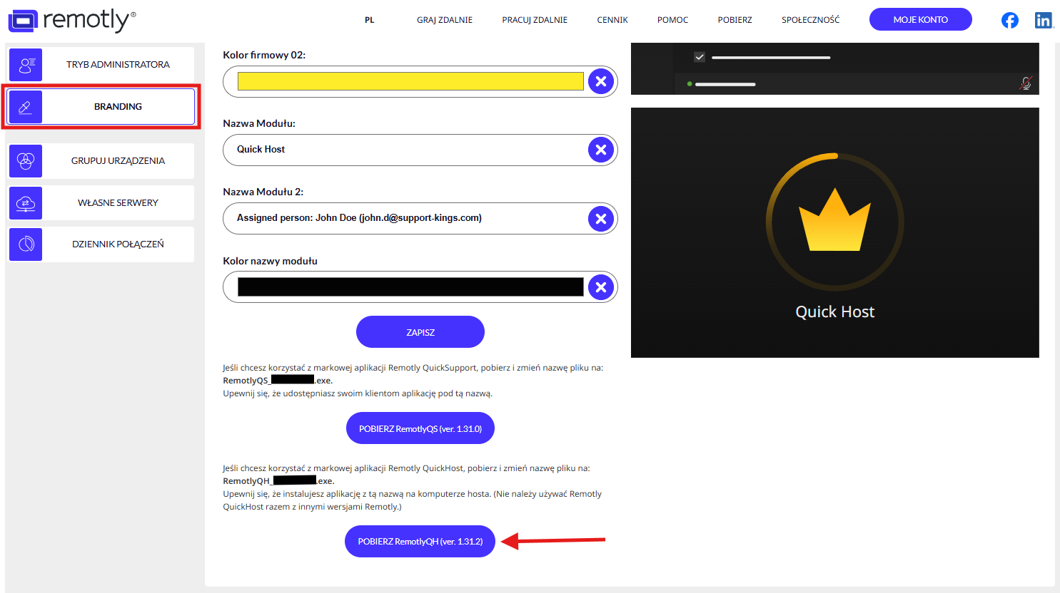 2. Edytuj wygląd i pobierz Remotly QuickHost dedykowany dla Twojej organizacji z panelu administratora (https://remotly.com/pl/logowanie):