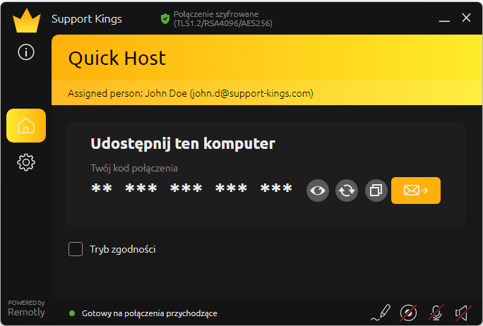 – Remotly QuickHost nie wymaga logowania się użytkowników końcowych do konta Remotly.