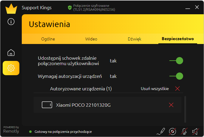 8. Upewnij się, że Twoje główne urządzenie (np. telefon lub komputer/laptop) jest autoryzowane na zdalnym komputerze, na którym zainstalowany jest QH. W poniższym przykładzie autoryzowany jest Xiaomi POCO. Będąc administratorem i posiadając swoje główne autoryzowane urządzenie możesz autoryzować połączenia przychodzące od innych użytkowników serwisujących dany komputer. Możesz również włączyć/wyłączyć udostępnianie schowka.