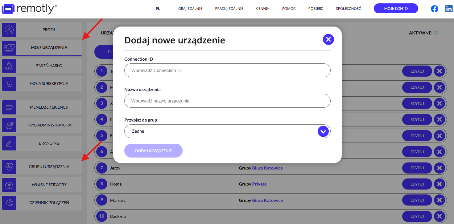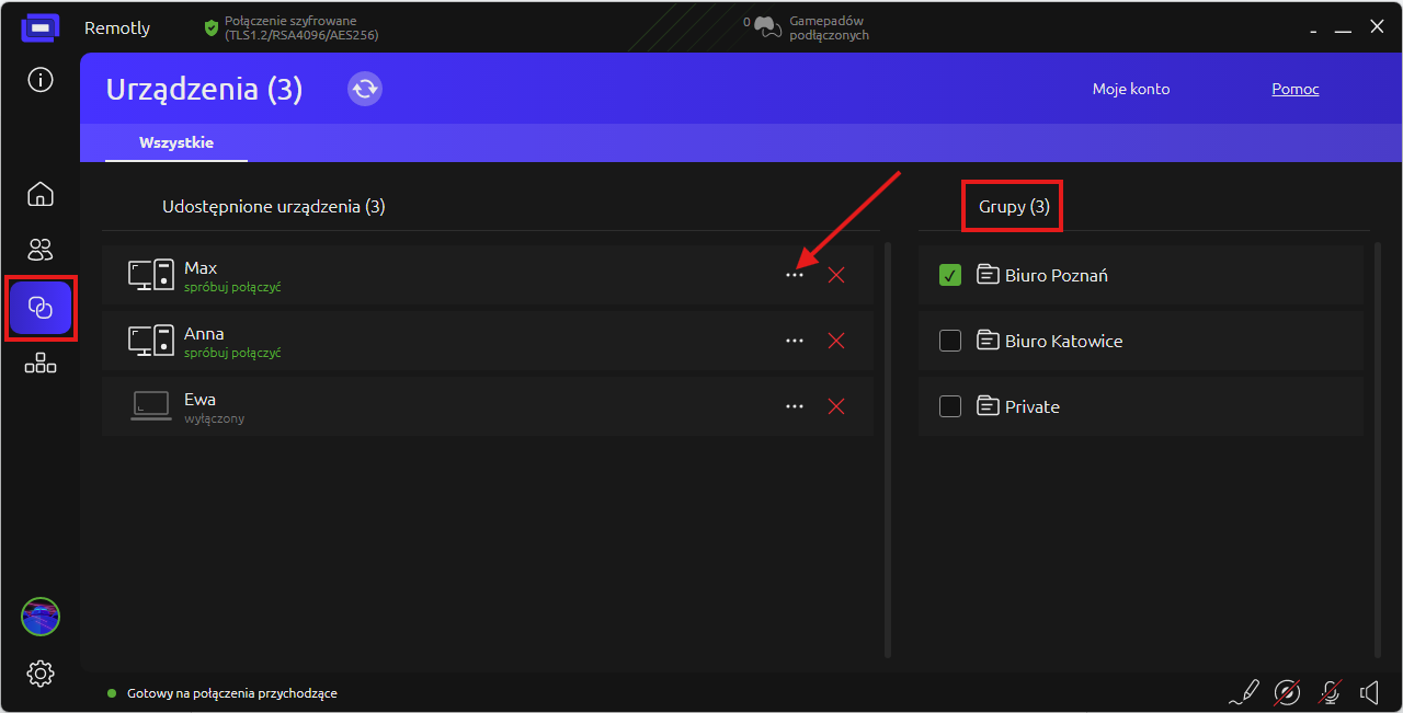 7. Aby łatwo wybrać urządzenie końcowe, do którego chcesz się połączyć w skorzystaj z filtrowania w głównym interfejsie Remotly lub znajdź urządzenie w grupach zapisanych w zakładce “Urządzenia” również w interfejsie Remotly:
