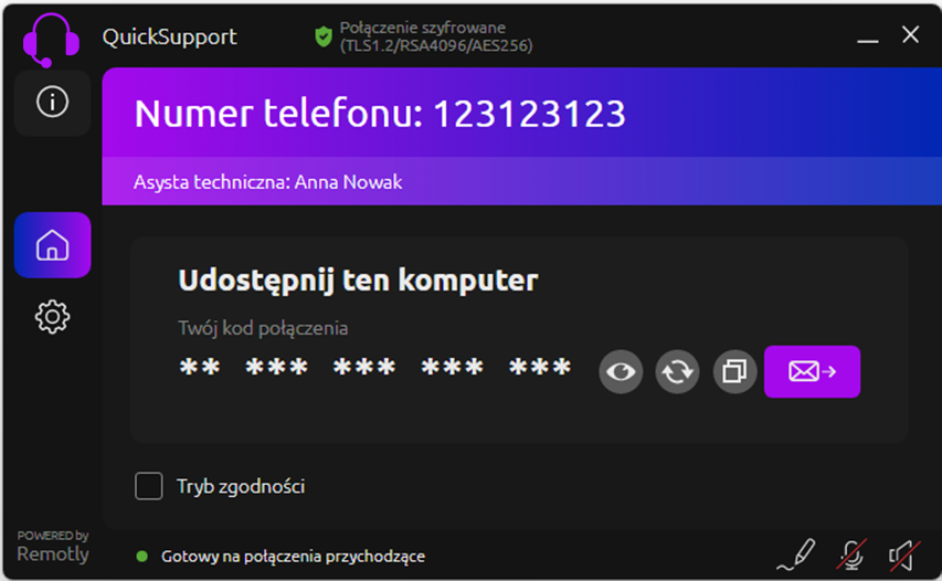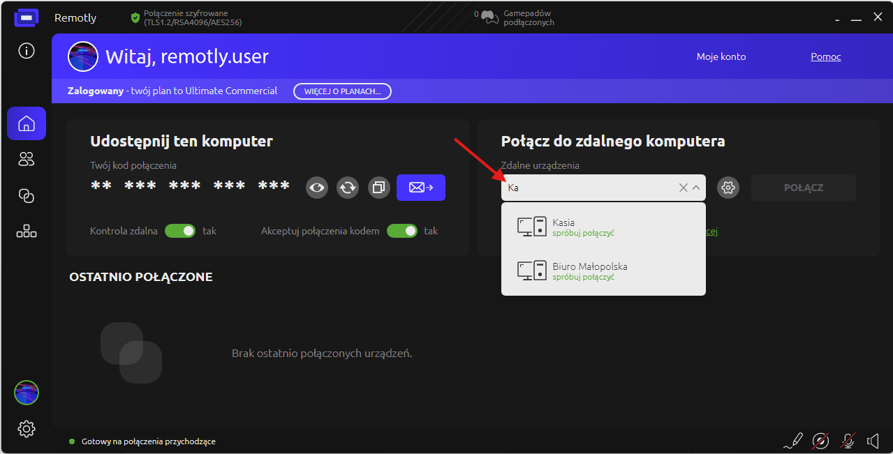 5. Pozyskaj kod połączenia od użytkownika końcowego i użyj go łącząc się ze swojej pełnej wersji aplikacji Remotly pobranej ze strony: https://remotly.com/pl/pobierz.