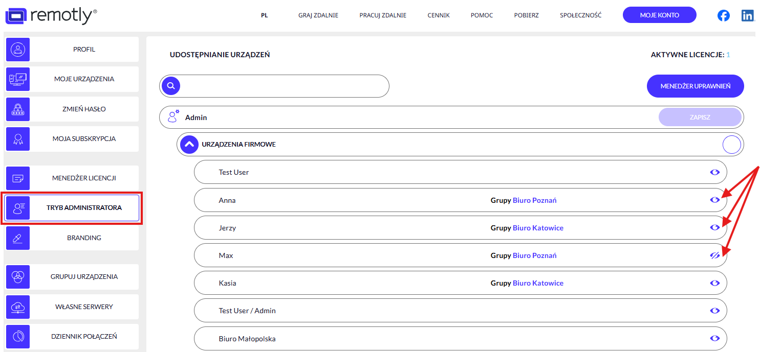 Z panelu administratora możesz również zarządzać uprawnieniami administratora, nadawać licencje użytkownikom ze swojej firmy i pozwolić wybranym użytkownikom na dostęp do użytkowników końcowych (zakładka “Tryb administratora”) za pomocą ikony oka.