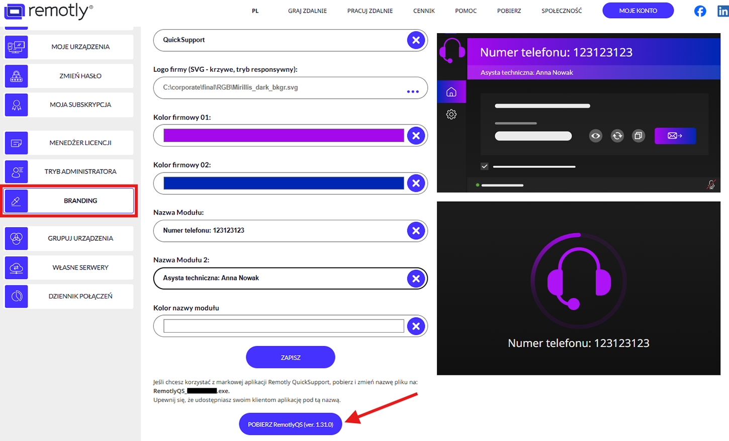 2. Edytuj wygląd i pobierz Remotly QuickSupport dedykowany dla Twojej organizacji z panelu administratora (https://remotly.com/pl/logowanie):